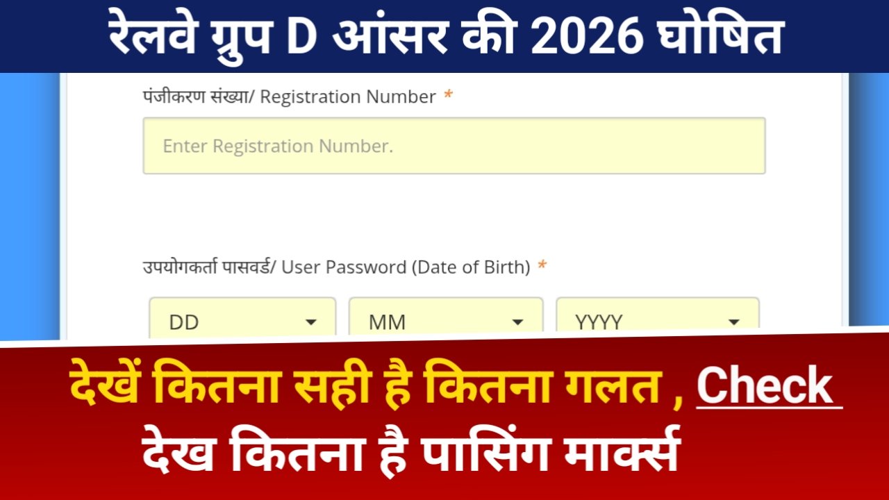 RRB Group D Answer Key 2026 : रेलवे में सरकारी नौकरी का सपना देख रहे लाखों उम्मीदवारों का इंतजार आखिरकार खत्म हो गया है। Railway Recruitment Board ने ग्रुप-डी भर्ती परीक्षा की प्रोविजनल उत्तर कुंजी (answer key) 17 फरवरी 2026 शाम 5 बजे जारी कर दी है। परीक्षा 27 नवंबर से 10 फरवरी के बीच आयोजित हुई थी और अब उम्मीदवार अपने स्कोर का अनुमान लगा सकते हैं।
